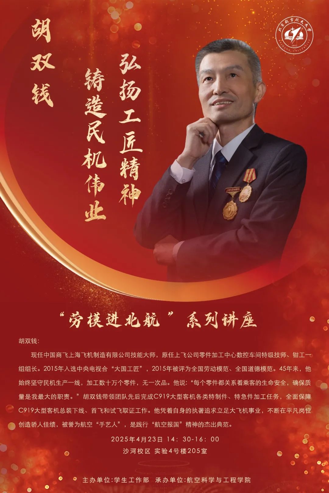 ºú˫Ǯ£¬ÏÖÈÎÖйúÉÌ·ÉÉϺ£·É»úÖÆÔìÓÐÏÞ¹«Ë¾ÊÖÒÕ¾Þ½³£¬ÔÈÎÉϷɹ«Ë¾Áã¼þ¼Ó¹¤ÖÐÐÄÊý¿Ø³µ¼äÌØ¼¶¼¼Ê¦¡¢Ç¯¹¤Ò»×é×鳤¡£2015ÄêÈëÑ¡ÖÐÑëµçÊǪ́¡°´ó¹ú¹¤½³¡±£¬2015Äê±»ÆÀΪÌìÏÂÀͶ¯Ä£·¶¡¢ÌìÏÂÆ·µÂÄ£·¶¡£