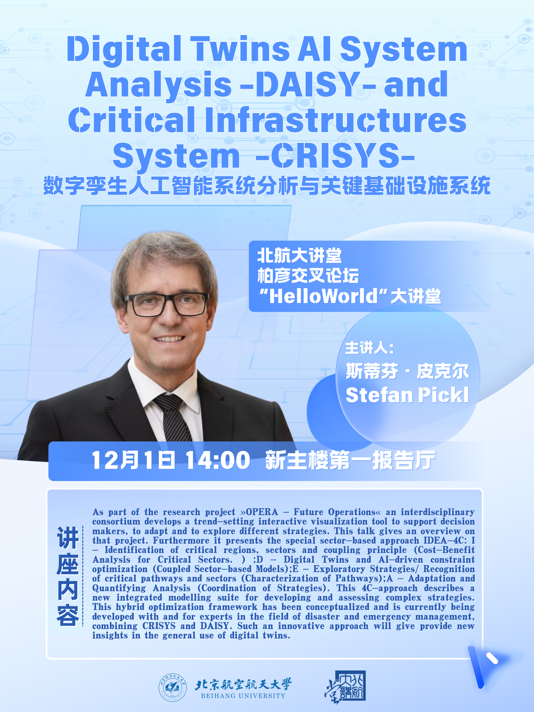 As part of the research project ?OPERA - Future Operations? an interdisciplinary consortium develops a trend-setting interactive visualization tool to support decision makers, to adapt and to explore different strategies. This talk gives an overview on that project. Furthermore it presents the special sector-based approach IDEA-4C: I - Identification of critical regions, sectors and coupling principle (Cost-Benefit Analysis for Critical Sectors. £©; D - Digital Twins and AI-driven constraint optimization (Coupled Sector-based Models); E - Exploratory Strategies/ Recognition of critical pathways and sectors (Characterization of Pathways); A - Adaptation and Quantifying Analysis (Coordination of Strategies). This 4C-approach describes a new integrated modelling suite for developing and assessing complex strategies. This hybrid optimization framework has been conceptualized and is currently being developed with and for experts in the field of disaster and emergency management, combining CRISYS and DAISY. Such an innovative approach will give provide new insights in the general use of digital twins.